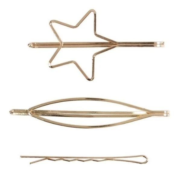 Pakken indeholder 3 stk. forgyldte hårspænder i metal.
