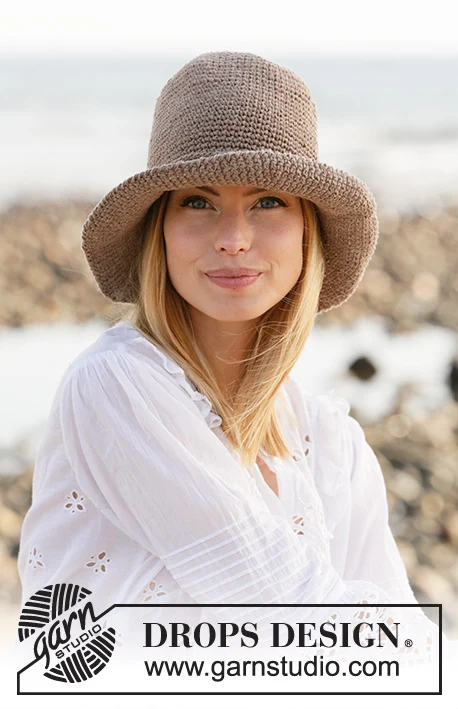 Hæklet hat i DROPS Bomull-Lin eller DROPS Paris. Arbejdet hækles ovenfra og ned med fastmasker.