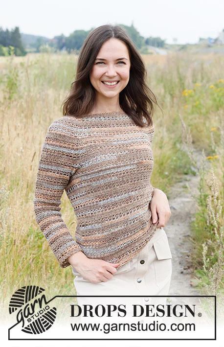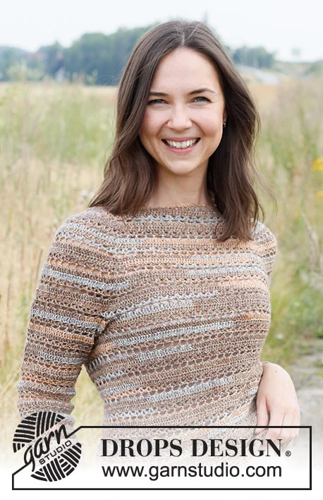 Hæklet bluse i DROPS Fabel. Arbejdet hækles ovenfra og ned med rundt bærestykke og hulmønster. Størrelse XS - XXL.