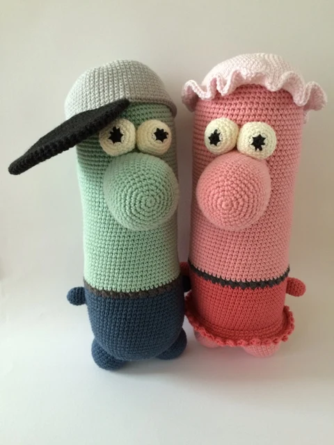 Detaljeret hækleopskrift på Karl & Rosa. Der medfølger opskrift på både kasketten og sommerhatten. Karl & Rosa bliver begge ca. 30 cm høje.