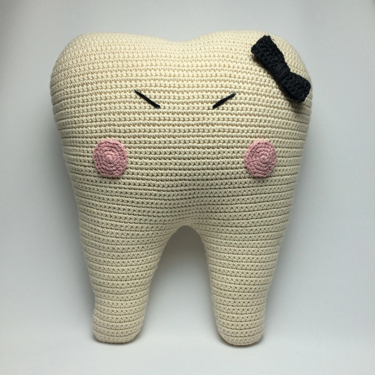Produktet: Detaljeret hækleopskrift på puden Little Tooth. Tandpuden bliver ca. 30 cm høj.