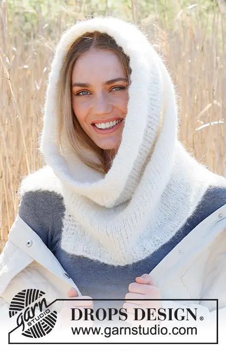 Strikket elefanthue / balaclava i DROPS Melody. Arbejdet strikkes nedefra og op i glatstrik med slids i siderne.