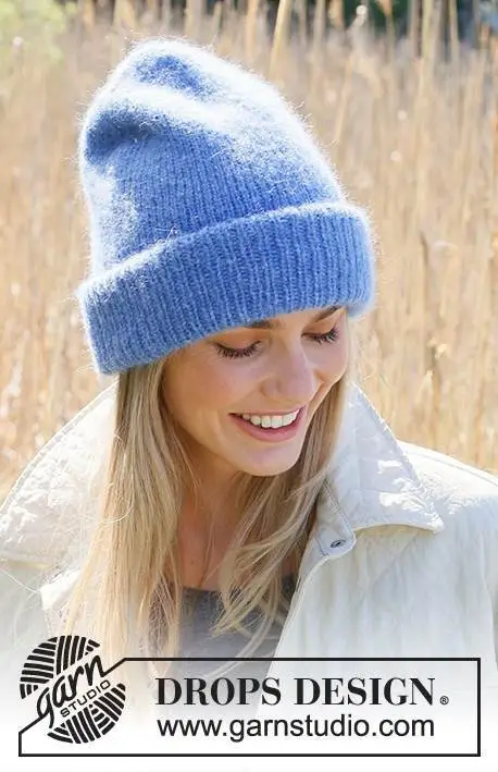 Strikket hue / hipster hue i DROPS Air. Arbejdet strikkes ovenfra og ned i glatstrik med dobbelt bukkekant i rib.
