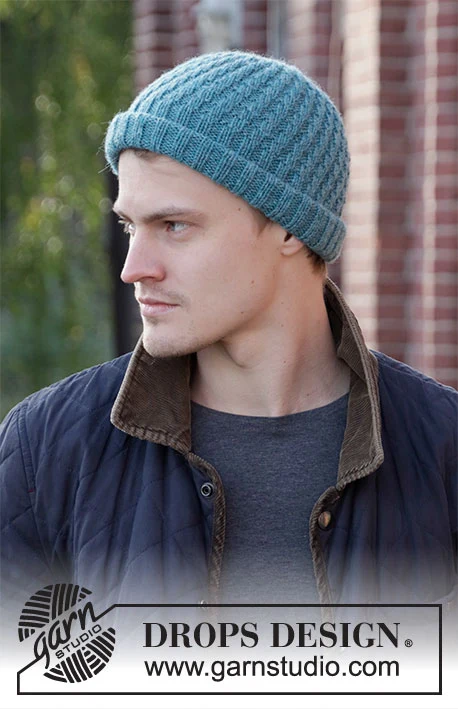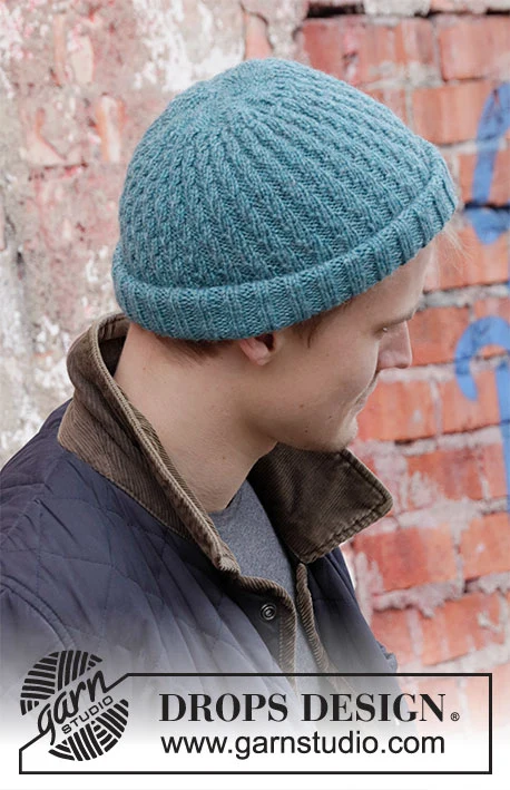 Strikket hue / hipsterhue i DROPS Lima til herre. Arbejdet strikkes med rib i spiral.
