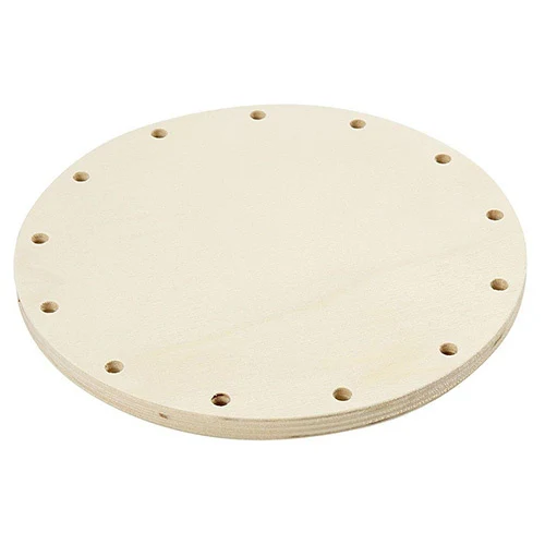 Rund træplade med 13 huller i kanten.