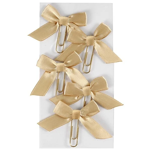 Forgyldt metalklips med påsat sløjfe af satinbånd.