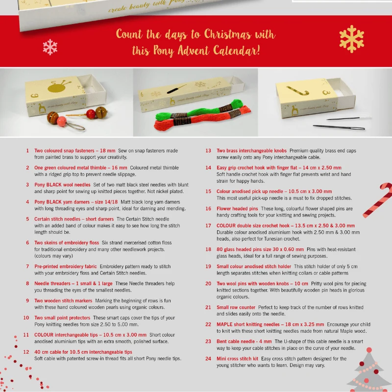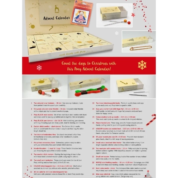 Julekalenderen indeholder 24 låger, som er fyldt med produkter fra Pony til dine strikke- og hækleprojekter i den søde juletid.