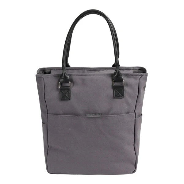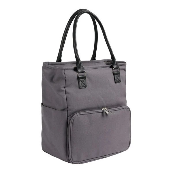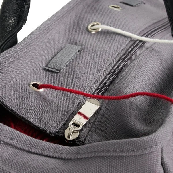 Praktisk mørkegrå garntaske med en lynlåslomme foran.