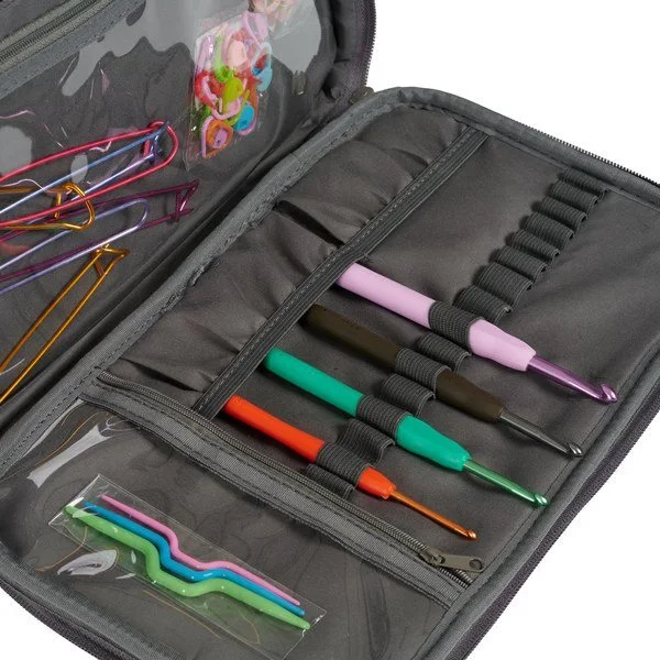 Garntasken kommer i en mørkegrå farve med en lynlåslomme, hvor der er massere inddelinger der holder styr på både strikkepinde og andet tilbehør.