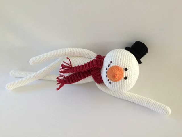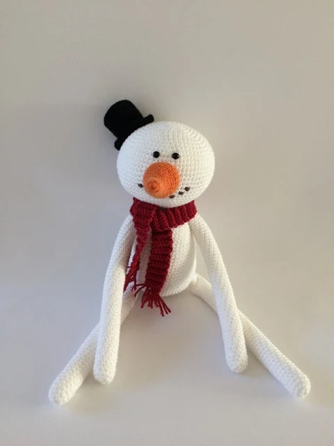 Produktet: Detaljeret hækleopskrift på snemand Hr. Frost. Hr. Frost bliver ca. 40 cm lang.