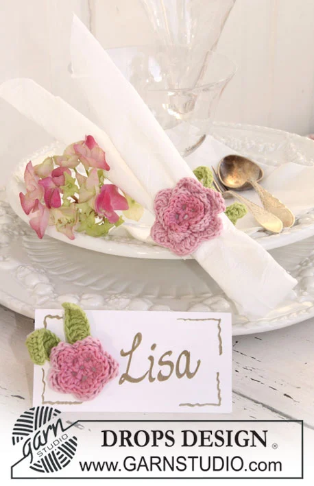 Hæklet DROPS serviet- og bordkortpynt med blomst i DROPS Safran.