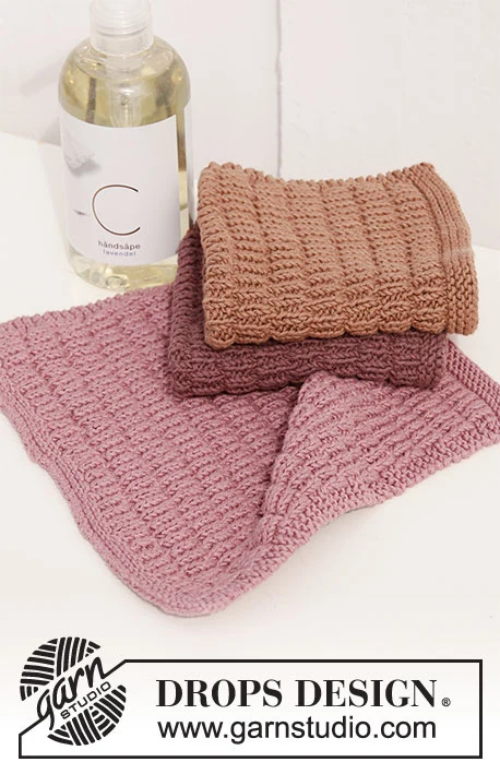 Strikkede klude med strukturmønster i DROPS Safran. Arbejdet strikkes frem og tilbage.