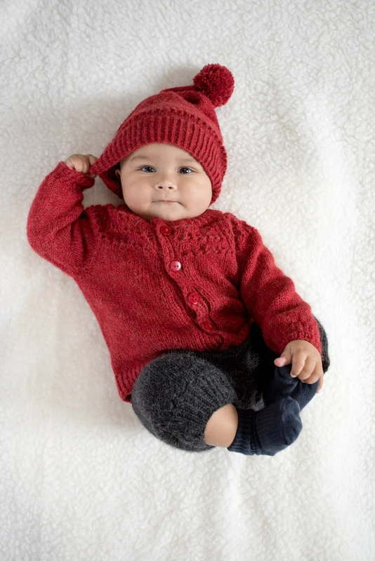 Cardigan, bukser & hue strikket i Dale Alpakka Forte.