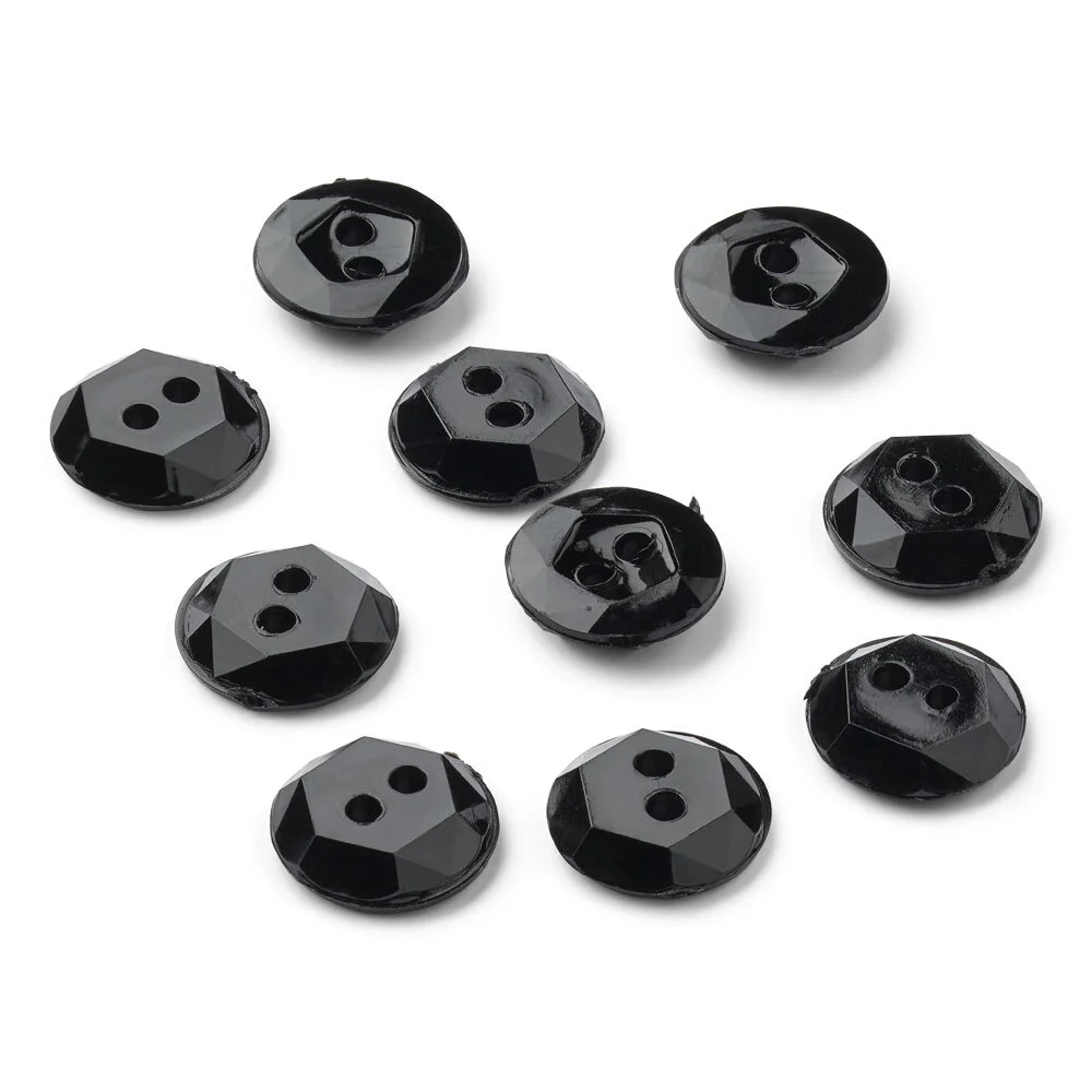 Et sæt med 10 sorte krystalknapper i plast, hver med en diameter på 12 mm. Knapperne har en facetslebet overflade, der reflekterer lyset og giver et eksklusivt præg til dine projekter.