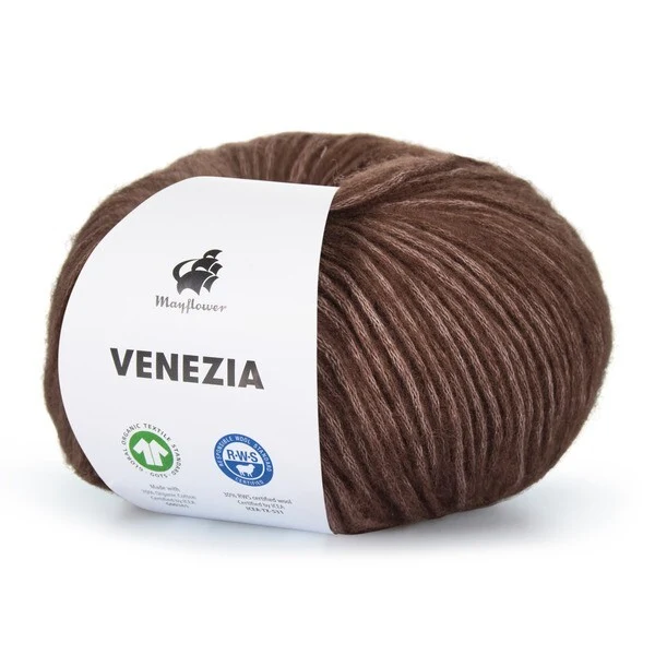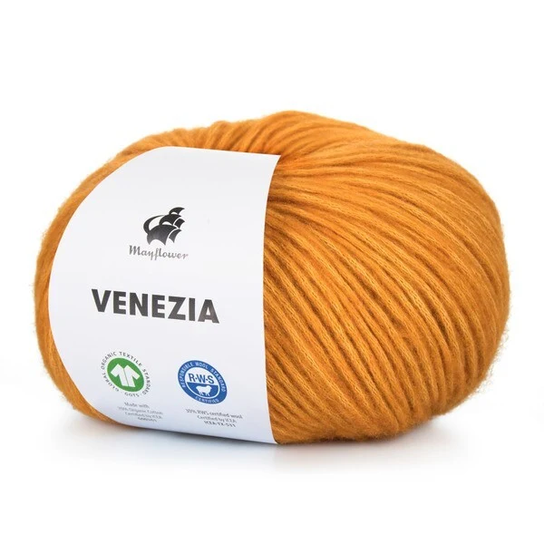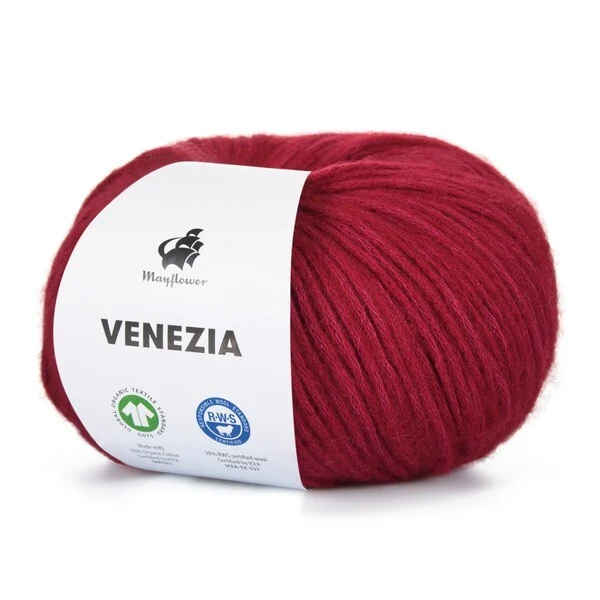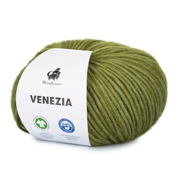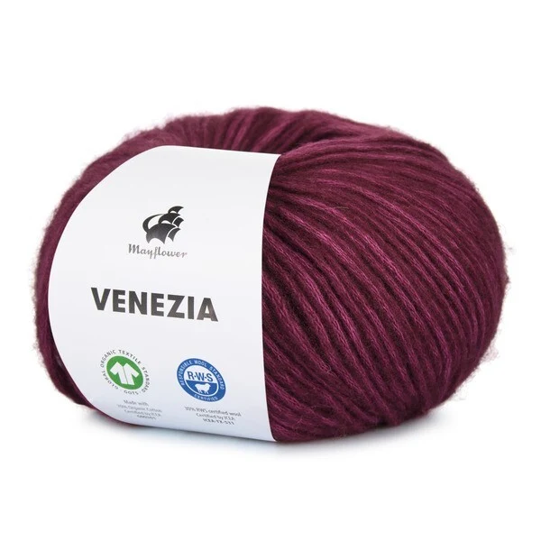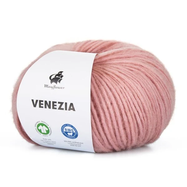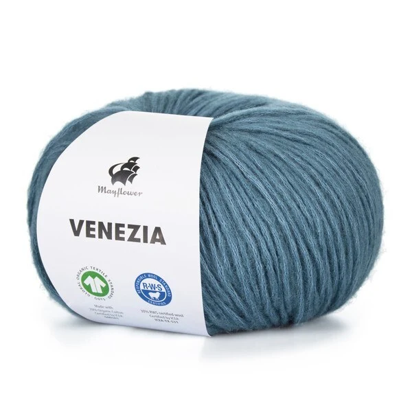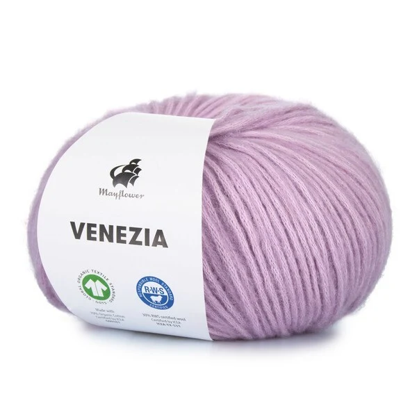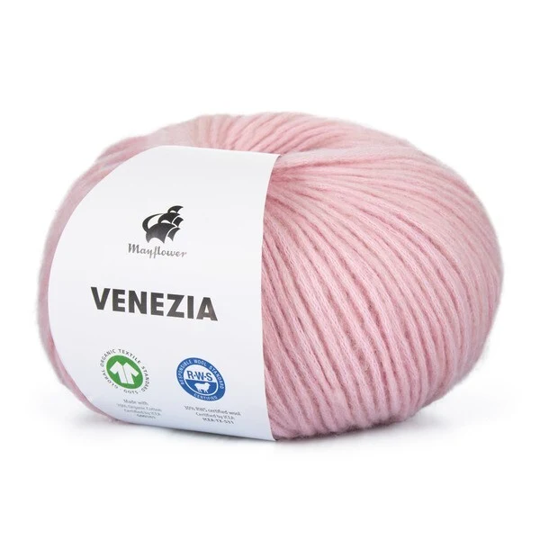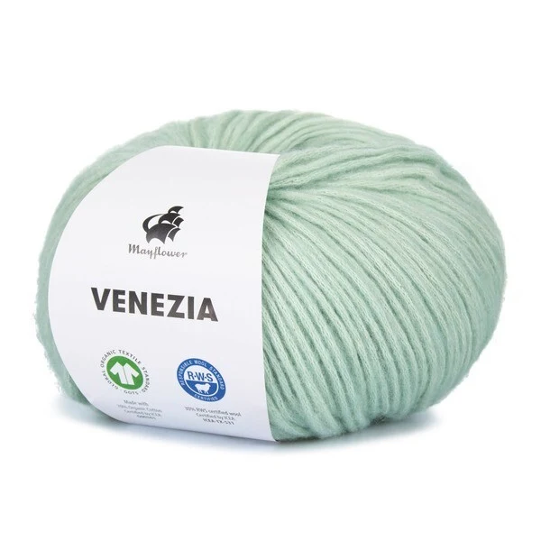 Mayflower Venezia er et luftigt og let garn i en skøn blanding af GOTS-certificeret bomuld og RWS-certificeret merinould.