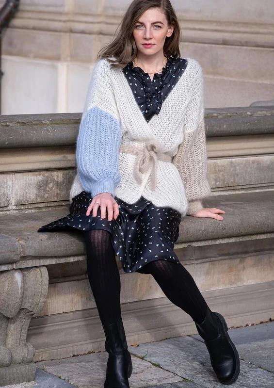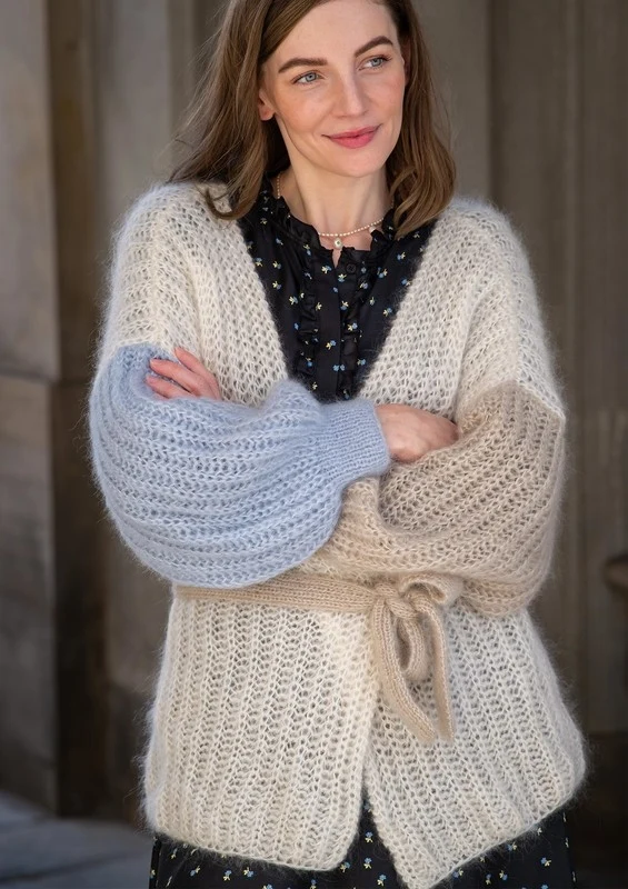 BittenJakken er strikket med 3 tråde Mayflower Super Kid Silk, som tilsammen giver jakken sin lette og luftige pasform. BittenJakken er en perfekt kombination mellem komfort og luksus i form af en lækker oversize jakke, som kan bindes i livet.