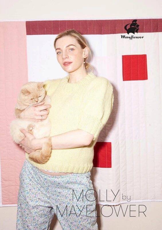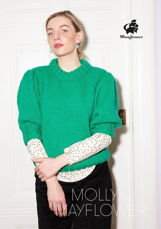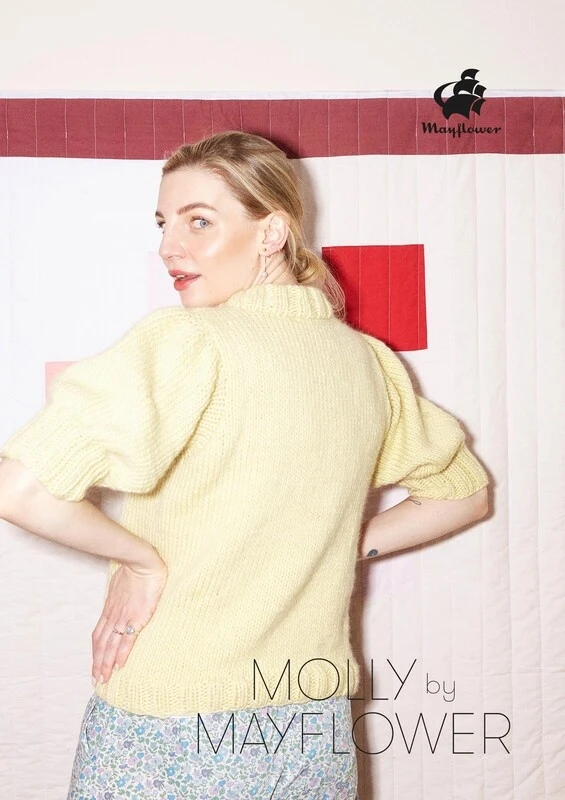 Blusen er strikket i Mayflower Molly Fine, som består af 100 % letspundet uld med en løbelængde 135 meter pr. 100 gram. Molly Egelind har både lagt navn til og været med til at udvikle Molly Fine. Garnkvaliteten blev udviklet, fordi Molly elsker hurtige og nemme strikkeprojekter i tykt garn, men samtidig behøver kraftigt strik ikke at blive tungt.