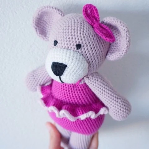 Fru Bjørn: Let læselig og detaljeret hækleopskrift på Fru Bjørn. Fru Bjørn bliver ca. 18 cm høj. En sød lille bjørn med det fineste strutskørt.
