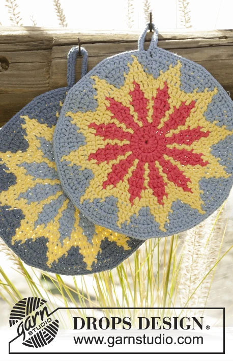 Hæklet rund DROPS grydelap i ”Paris” med flerfarvet mønster.