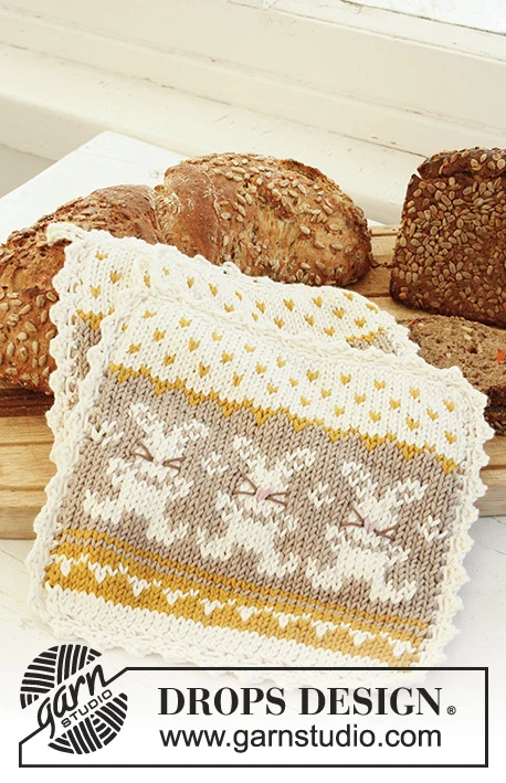 Strikket DROPS grydelap med mønster til påske i ”Paris”.