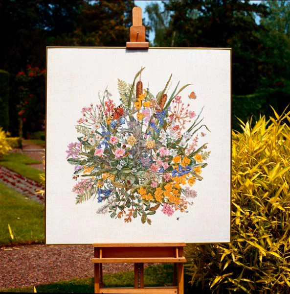 Smukt blomster-broderikit med målene 100 x 105 cm.