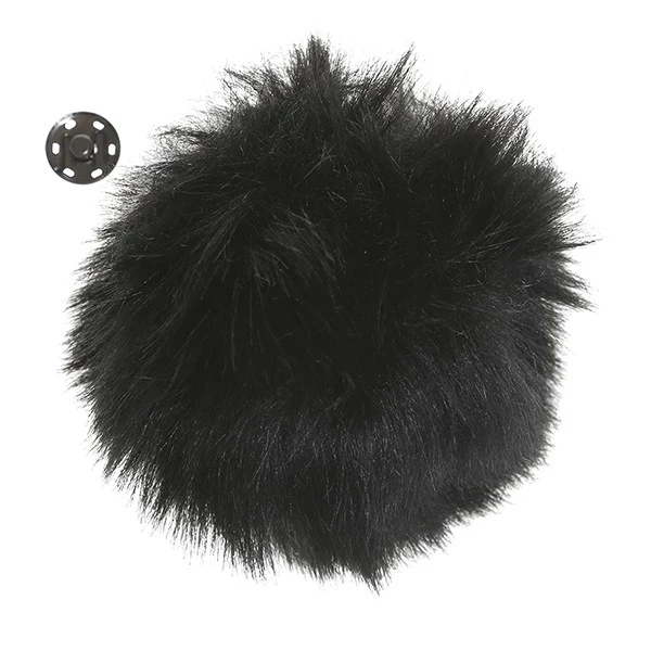 Pomponen er lavet af fake fur og kommer med en smart trykknap i bunden, så den nemt kan påsættes dit projekt.