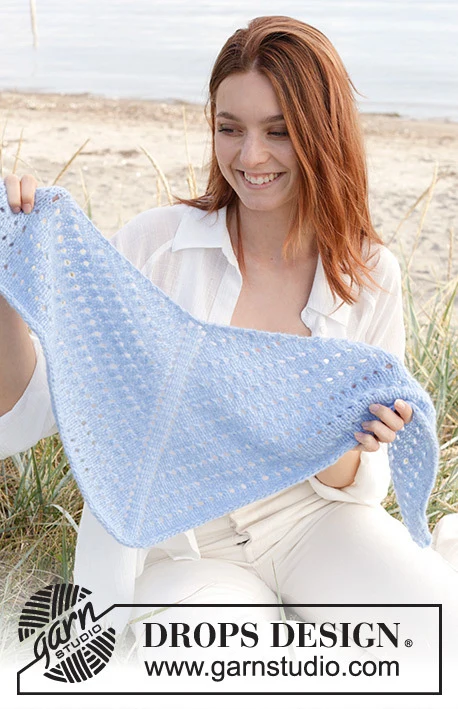 Strikket sjal i DROPS Air. Arbejdet strikkes oppefra og ned med hulmønster og i-cord kant.