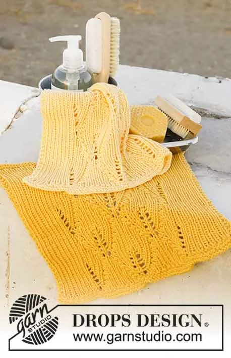 Strikket klud med rib og bladmønster. Arbejdet er strikket i DROPS Safran
