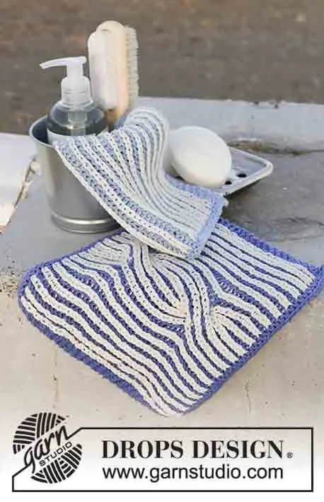 Strikkede klude med tofarvet patent og snoning. Arbejdet er strikket i DROPS Cotton Light