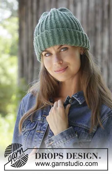 Strikket hue med patent og ombuk. Arbejdet er strikket i DROPS Merino Extra Fine.