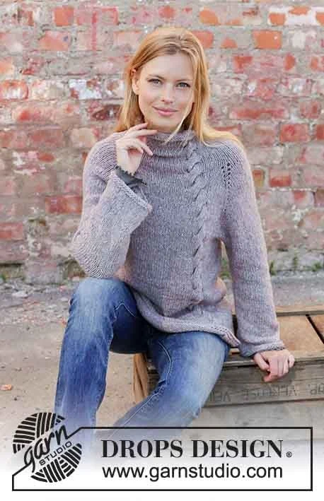 Strikket bluse med raglan i DROPS Sky. Arbejdet er strikket ovenfra og ned med snoning, høj hals og rullekant. Størrelse S - XXXL.
