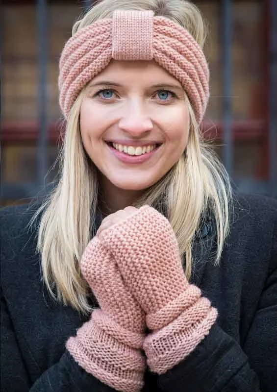 Pandebånd og pulsvarmere med rillemønster strikket i Mayflower Easy Care.