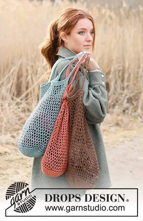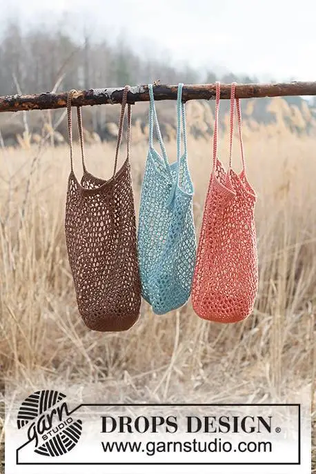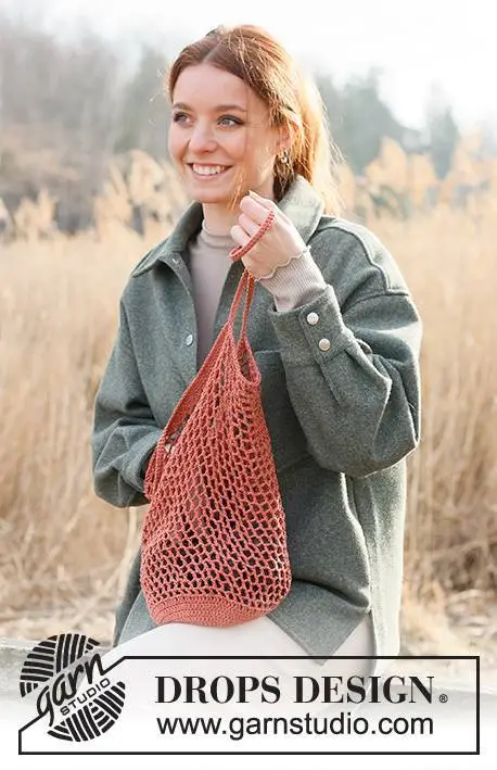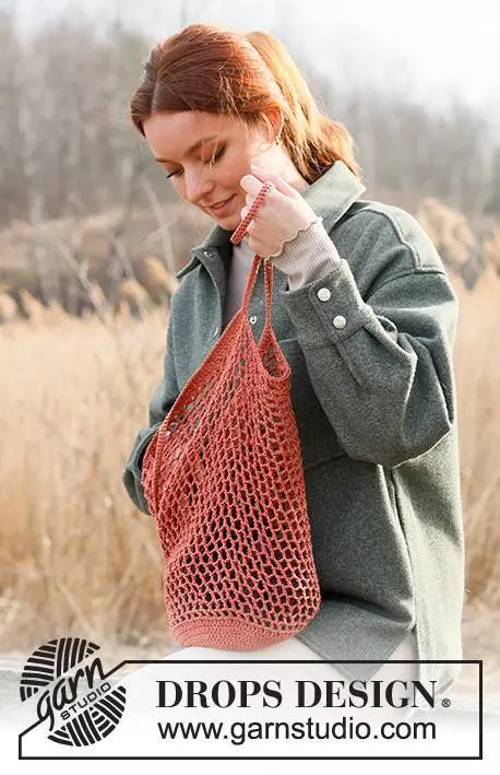 Hæklet taske / bærenet i DROPS Safran. Arbejdet hækles fra nedefra og op.