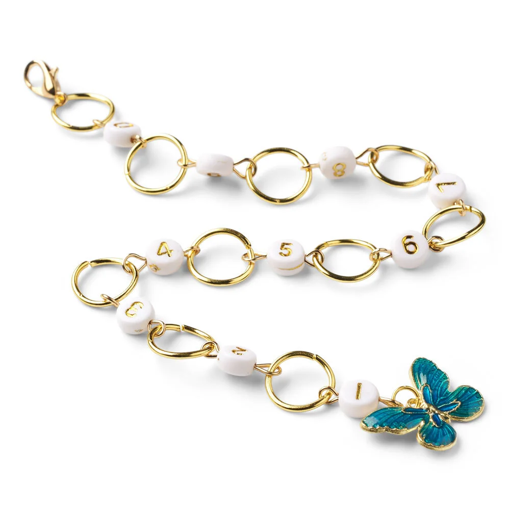 Strikkefisken fra LindeHobby er et smart og æstetisk redskab, der hjælper dig med at holde styr på dine rækker og masker under strikning og hækling. Den består af en kæde med hvide perler nummereret fra 0 til 9, hver forbundet med guldfarvede metalringe. Kæden afsluttes med en dekorativ, turkis sommerfugl, og passer til pinde og nåle op til 9.00 mm.