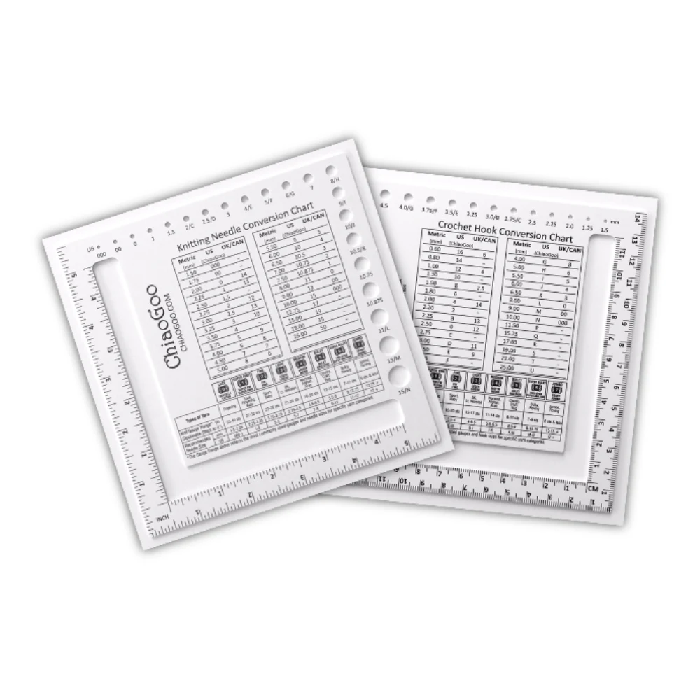 ChiaoGoo Strikke- og Hæklediagram er et alsidigt og praktisk værktøj til både strik og hækling. Det er tosidet og giver dig både en pindemåler, en lineal samt et konverteringsdiagram, der viser sammenhængen mellem US- og millimeterstørrelser for både strikkepinde og hæklenåle. Desuden indeholder det en oversigt over garnvægt og anbefalede nåle-/pindestørrelser.
