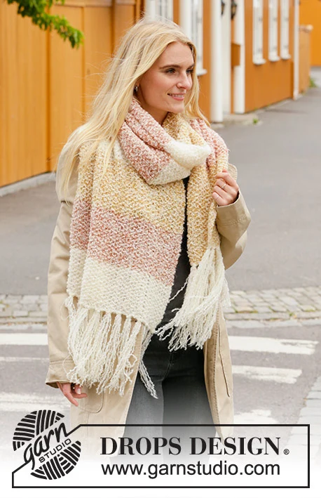 Strikket halstørklæde med frynser i DROPS Alpaca Bouclé og DROPS Kid-Silk. Arbejdet strikkes med striber og perlestrik.