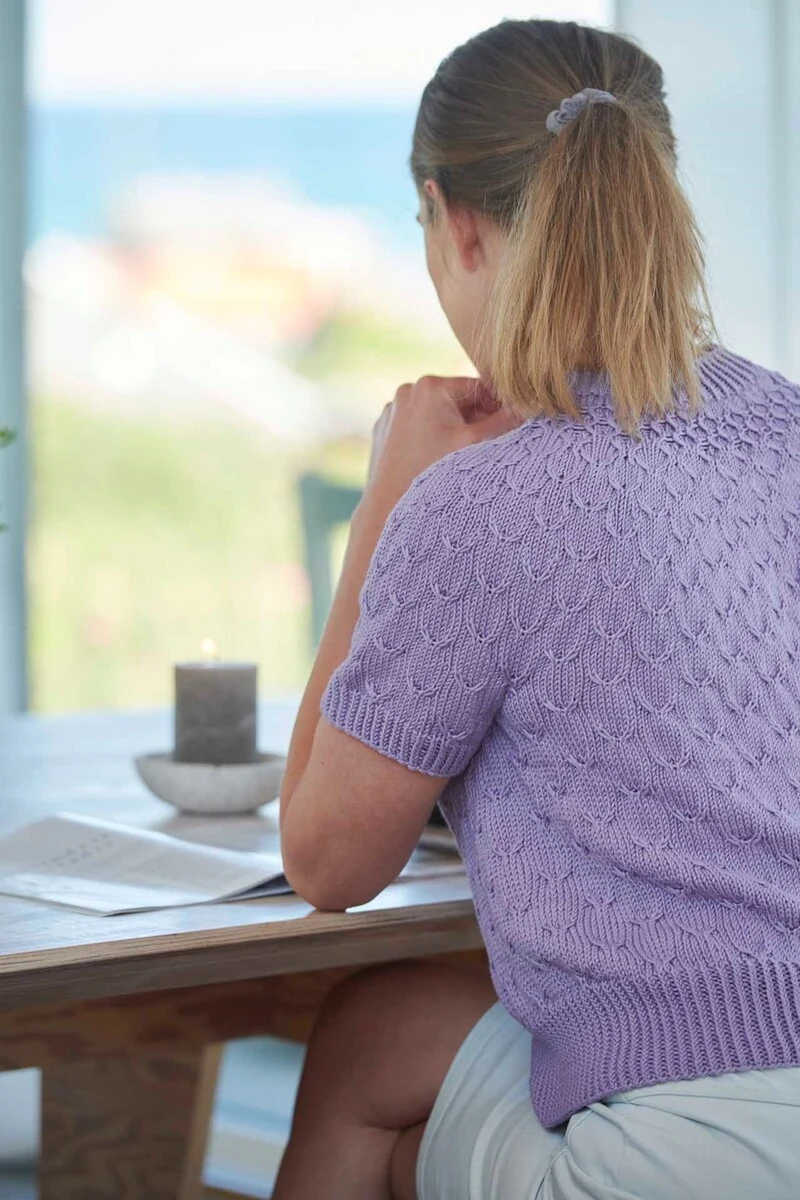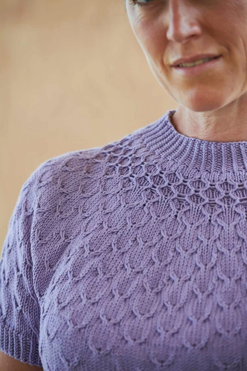 Skøn bluse med korte ærmer, et flot snit og et gennemgående mønster med stor effekt. Ved halsåbning, ærmekanter og den nederste kant er der strikket rib med drejet ret og vrang, hvilket giver en flot og markeret ribkant. Birdie Tee strikkes nedefra og op til ærmegabet. Derefter strikkes hvert ærme for sig, hvorefter arbejdet samles på en rundpind og færdiggøres med et rundt bærestykke. Til slut er der derfor meget lidt monteringsarbejde.